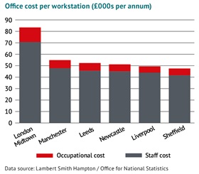 Significant as property costs are to a business, as a general rule, staff costs in a brand new building typically account for around three quarters of a business’ expenditure. Considered overall, the total cost of a single office workstation (i.e. staff and property) in a brand new building within London’s Midtown costs £83,000 per annum, compared with £52,000 per annum in Leeds.