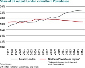 While London remains an undisputed global hub for talent and culture, the capital is facing acute and growing cost pressures, both for its resident population and businesses alike. These pressures partly reflect the unbalanced trajectory of the UK economy over recent decades; as London’s share of UK economic output has increased, the three regions which comprise the Northern Powerhouse have lost ground.