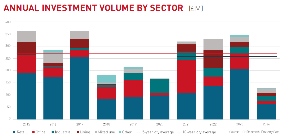 At £127.1m, investment volume in 2024 was 51% below the five-year average and the lowest annual total since 2012. While Q4 volume was 48% below the five-year quarterly average, there was a pick-up in transactional levels with 15 deals completed totalling £33.2m.