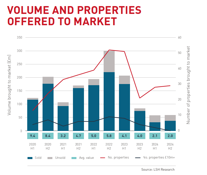 Since the second half of 2023 assets offered to the market have undergone acute decline and this has been the key driver of 2024’s low investment. Significantly, there has been a dearth of higher value properties in the £10m+ bracket with only six brought to market since mid-2023 compared with an average of ten per year. At £117m the volume of assets offered to the market in 2024 fell to its lowest since our records began, 61% below the five-year annual average.