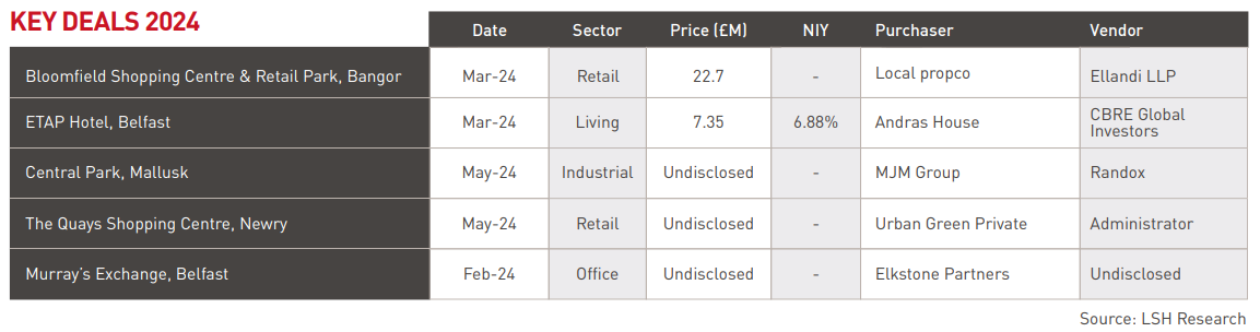 The largest deal of 2024 was Ellandi LLP’s sale of Bloomfield Shopping Centre and Retail Park, Bangor for £22.7m to a local propco. In Q2 Cork-based propco, Urban Green Private, purchased The Quays Shopping Centre, Newry for an undisclosed sum. Other transactions of note included The Linen Green, Dungannon (£4m), Homebase (£3m) and M&S (£1.95m) at Orritor Retail Park, Cookstown (£3m) and American Golf/Polonez at Boucher Crescent, Belfast (£1.5m). In the final quarter a Dublin based private investment firm sold the mixed use retail and office asset at 49-51 Donegall Place/42-46 Fountain Street, Belfast to a local propco for £7m.